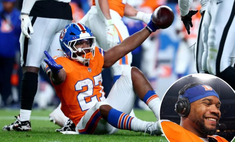 J.K. Dobbins #27 of the Denver Broncos speaks in an interview after an NFL football game against the Las Vegas Raiders at Empower Field At Mile High on November 06, 2025 in Denver, Colorado.