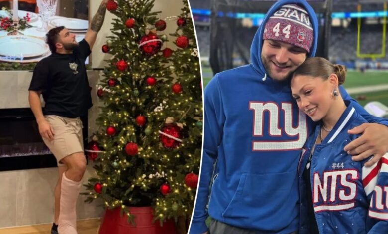 Cam Skattebo’s girlfriend shared a photo of him decorating their Christmas tree after the Giants star running back suffered a season-ending leg injury in a Week 8 loss to the Eagles. Instagram/Chloe Rodriguez