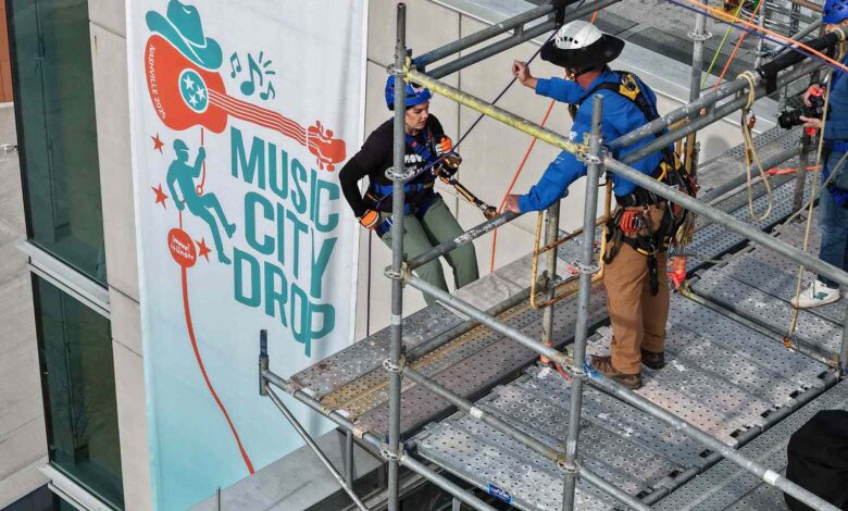 Sponsored by PEOPLE, Kroger, Rice Krispy Treats, Dollar General and Apex Moving + Storage, Music City Drop enabled 50 participants to rappel 20 stories down the side of the Omni Hotel as part of their fundraising effort.
