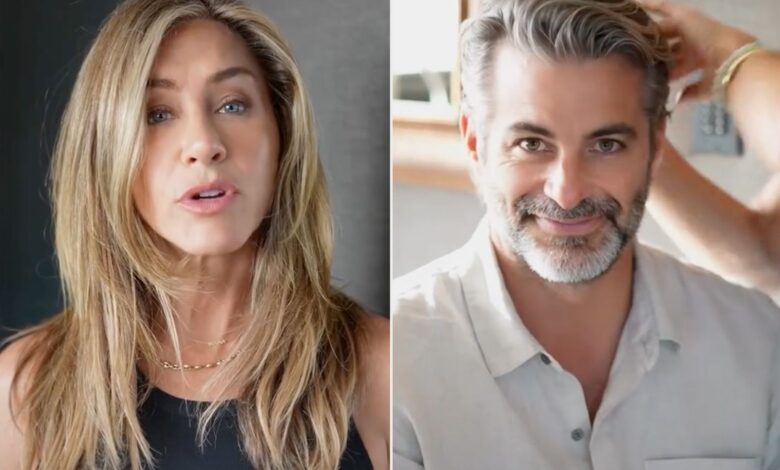 Instead of mixing the product in her hair, however, Aniston used it to style Curtis’ gray locks as he sat down next to her, smiling.