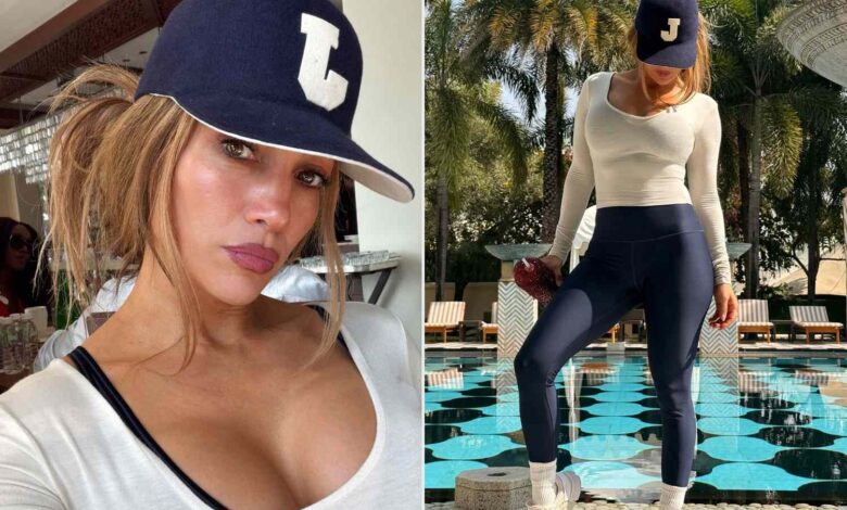 On Nov. 22, the Kiss of the Spider Woman star, 56, shared photos showing off her sporty style while sporting a skin-tight white long-sleeve, leggings and a matching baseball cap with the letter “J” embroidered on the front.