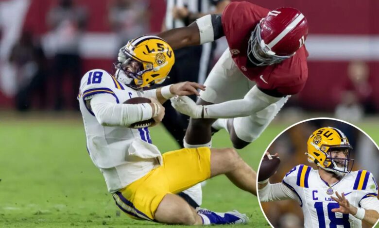 LSU quarterback Garrett Nussmeier narrowly avoided a horrifying neck injury after getting his head twisted on a facemask during the Tigers’ 20-9 loss to No. 4 Alabama on Saturday night at Bryant-Denny Stadium.