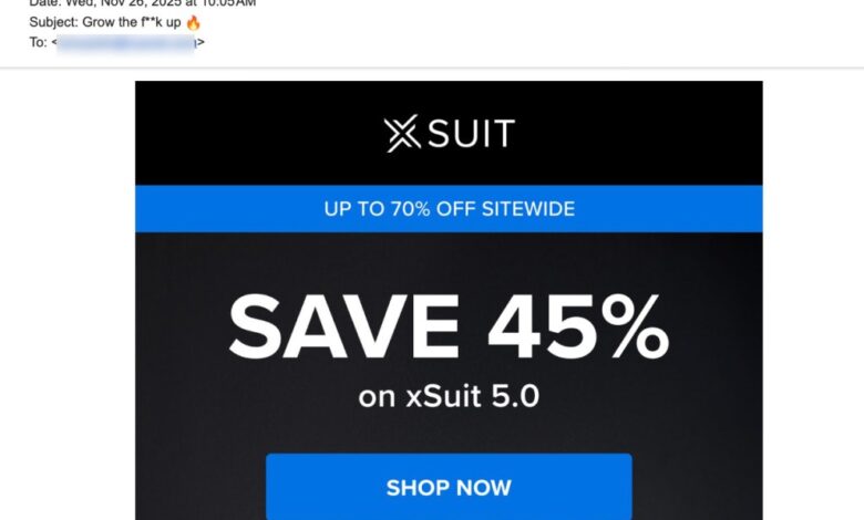 The profanity-laced directive was slapped into the subject line — inexplicably accompanied by a fire emoji — while the body of the email offered zero explanation, and instead hawked 45% off Black Friday suit deals.