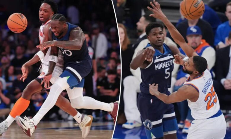 Minnesota Timberwolves' Anthony Edwards (5) passes over New York Knicks' Mikal Bridges (25).