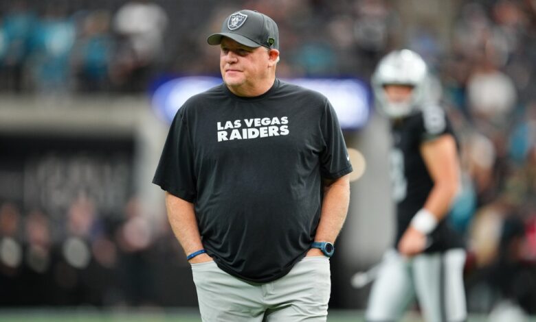Las Vegas offensive coordinator Chip Kelly walks on the field before the Raiders’ 30-29 loss to the Jaguars at Allegiant Stadium on Nov. 2, 2025 in Las Vegas. Getty Images