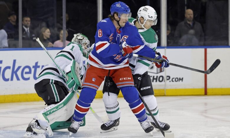 J.T. Miller battles for position with Ilya Lyubushkin during the Rangers’ OT win over the Stars on Dec. 2, 2025. Jason Szenes / New York Post