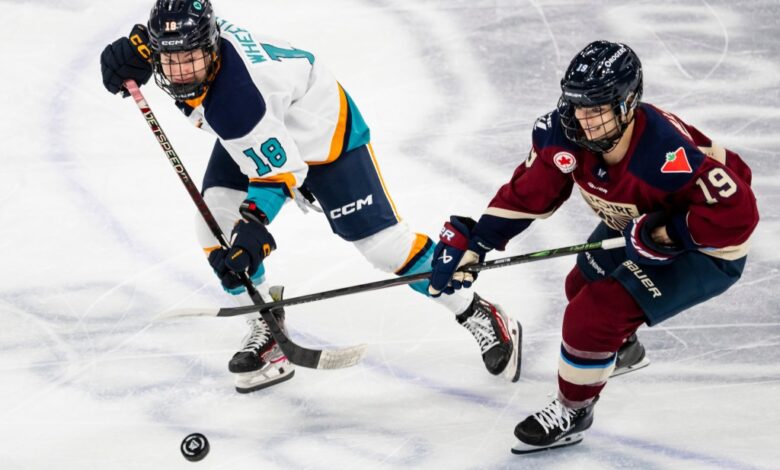 Maddi Wheeler (18) and Montréal’s Kaitlin Willoughby (19) vie for the puck during the Sirens’ loss to the Victoire in PWHL hockey action in Laval, Que. on Nov. 25, 2025. AP