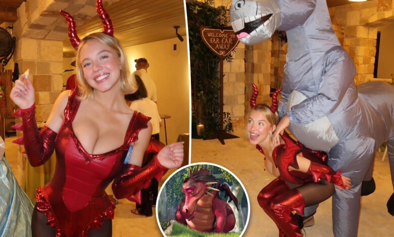 Sydney Sweeney dressed up as a sexy version of the dragon from the 2001 animated film “Shrek” while celebrating Friendsgiving.
