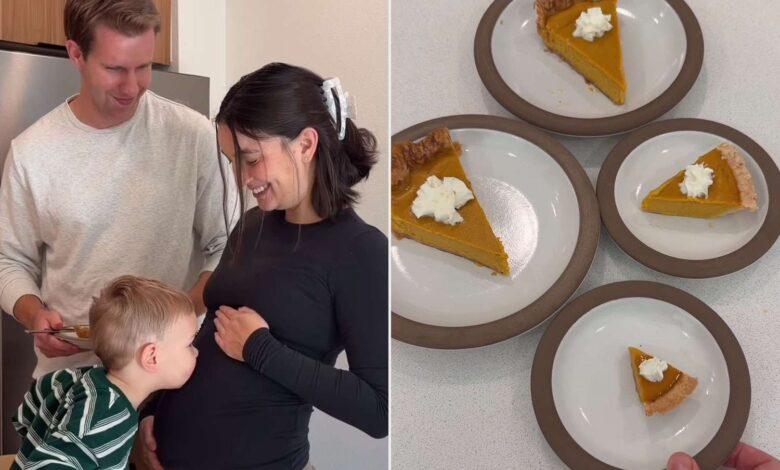 Culminating a series of videos she’s been posting of the various dishes she’s cooking up for the holiday, this latest one showed Mariko, Rickard and their toddler son, Theodore “Teddy,” getting ready to dig into some pumpkin pies. With a coy smile, Mariko placed two large pies next to a small pie and an even smaller one, revealing that their family of three will soon be four.