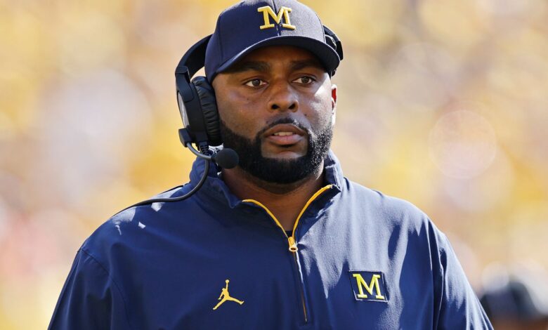 Sherrone Moore of the Michigan Wolverines is seen during warmups prior to the game against the Ohio State Buckeyes at Michigan Stadium on Nov. 29, 2025, in Ann Arbor, Mich.