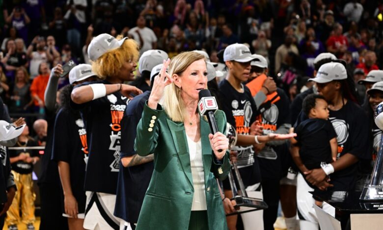 Commissioner Cathy Engelbert presents trophy to the Las Vegas Aces after the game against the Phoenix Mercury during Game Four of the WNBA Finals on October 10, 2025 at PHX Arena in Phoenix, Arizona. NBAE via Getty Images